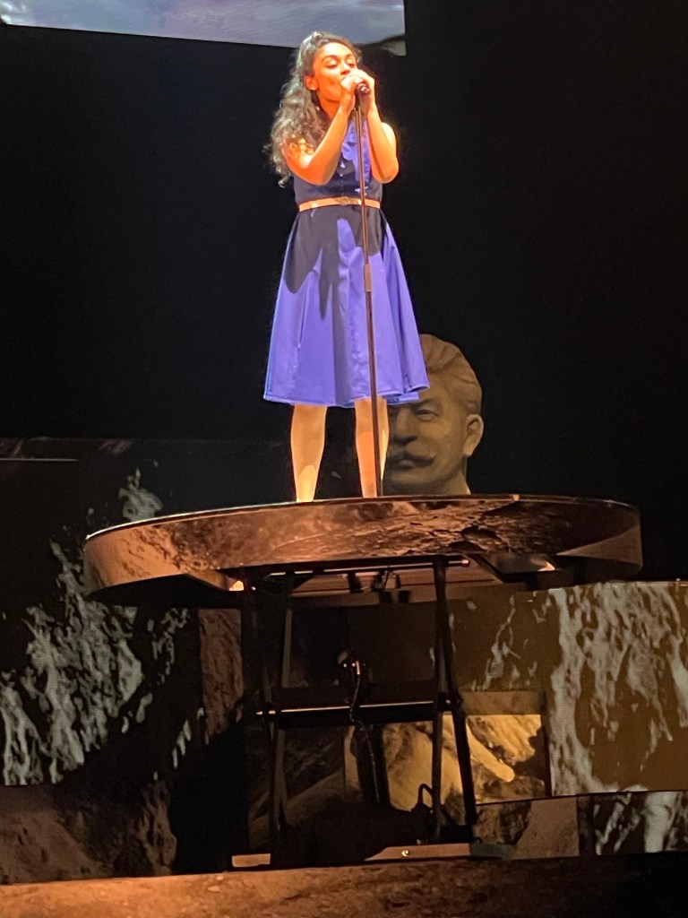 Belangrijker dan mijn stress en de reis is natuurlijk de voorstelling en wat ik ervan vind… Een 5 uur durende marathon-voorstelling, waarvan ongeveer een uur muziek. Met twee pauzes van ongeveer een half uur. En het duurde geen seconde te lang. Het boek vertelt het verhaal van een familie uit Georgië, zes generaties, met op de achtergrond de verschrikkingen van de vorige eeuw. De voorstelling volgt netjes de lijn van de roman. Je ontkomt er natuurlijk niet aan dat je verdicht. En daardoor volgen de grote momenten van de roman elkaar in hoog tempo op, waardoor je af en toe in ademnood komt. De dominante plaats die de muziek inneemt vind ik een vondst. Het doet de voorstelling ademen. Het bestaat uit oorspronkelijke volksmuziek, bekende popsongs, en eigen stukken van de muzikant Demira Jansen. De hele cast werkt mee aan wat niet zomaar een muzikale omlijsting is. Percussionist Sharon Harman en Singer-songwriter Demira en de volledige cast maken er een fantastische muziektheatervoorstelling van. Waarbij Selin Akkulak (in haar rol van Kitty) en vooral Sharlee Daanje (verteller en in haar rol van Nitsa) er wat mij betreft uit springen met een paar hartverscheurende momenten.