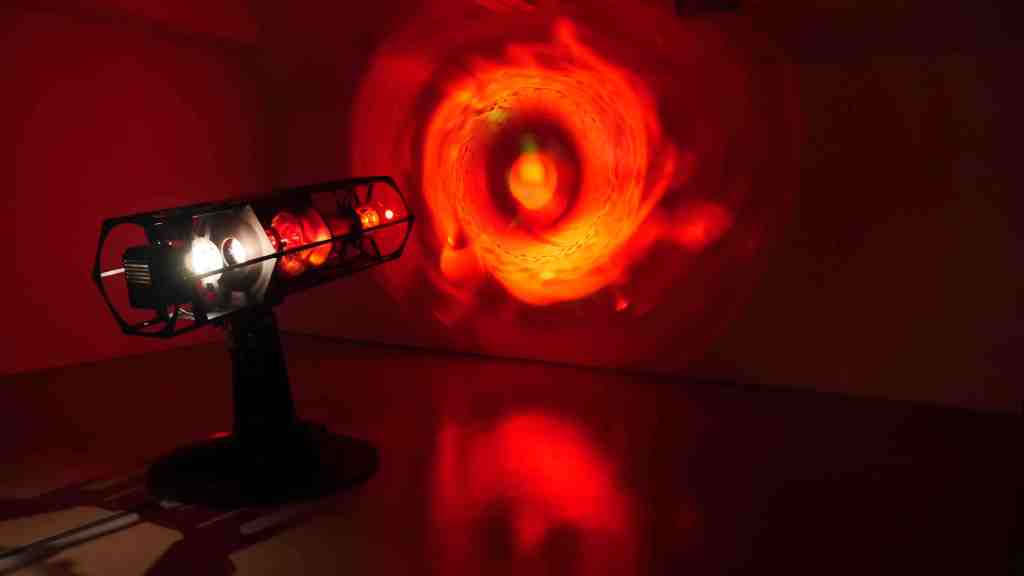 In het hart van haar presentatie staat de overweldigende kinetische sculptuur The Abysses of the Scorching Sun: een telescoop annex lichtkanon. Dit apparaat volgt de baan van de zon, real-time, real space, en kaatst het licht terug. Het verglijdt monumentaal over de muren, de vloer en het plafond en neemt het publiek op in een veelkleurige roes die betoverend is, maar ook vragen oproept over de intense machten, krachten en kwetsbaarheden van het klimaat.